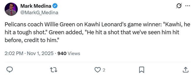 面对小卡这样的表现,对手鹈鹕主帅威利-格林也被征服,坦言莱昂纳德命中了一记高难度进球,他命中了这种球,我们也见过他以前命中这种球,就是这样。